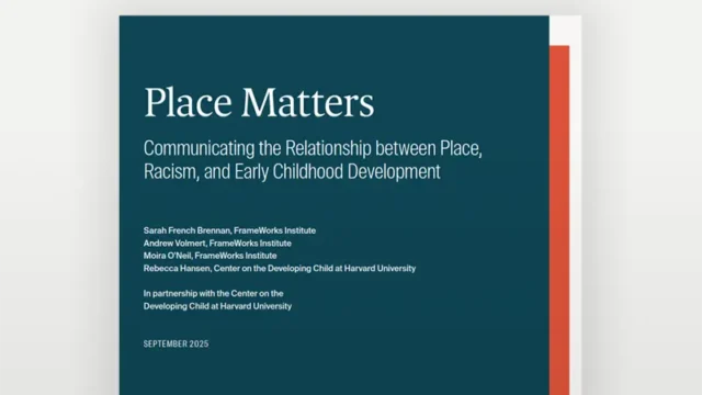 This strategic brief, developed in collaboration with the FrameWorks Institute, provides research-based messaging strategies for talking about the connections between place, racism, and early childhood development. It includes actionable recommendations that communicators can use and adapt in their own work to help shift public understanding and help mobilize support for systems and policies that ensure children and their caregivers have what they need to thrive.
